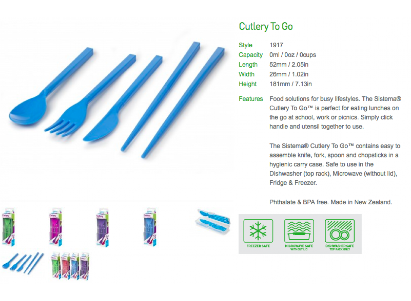 Food solutions for busy lifestyles. The Sistema® Cutlery To Go™ is perfect for eating lunches on the go at school, work or picnics. Simply click handle and utensil together to use.