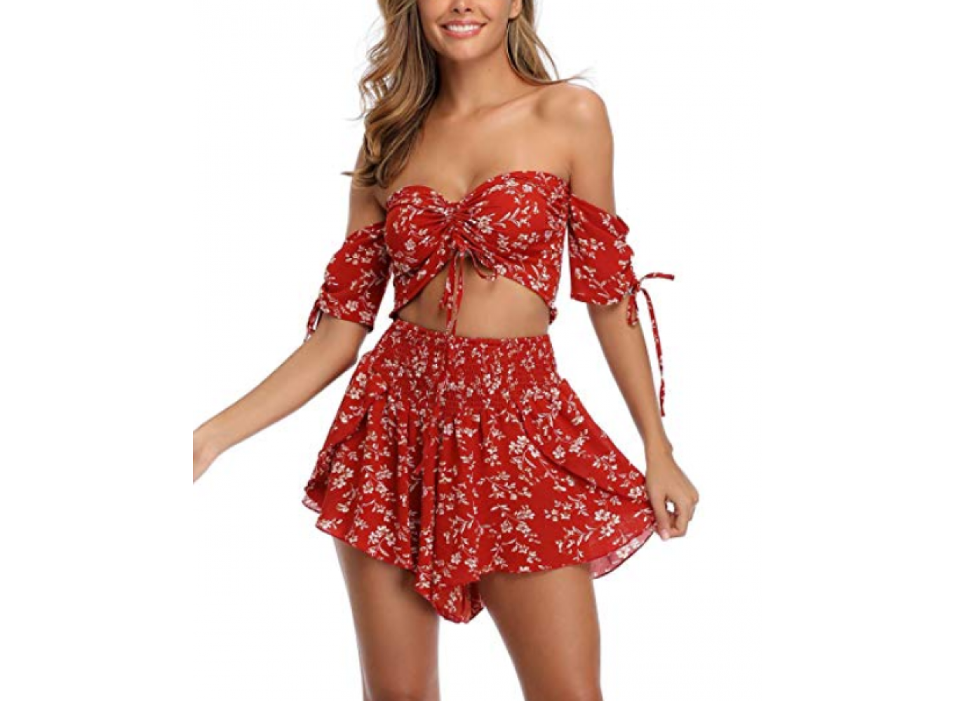 Conjunto Saia e Blusa Cropped Boho Floral Vermelho