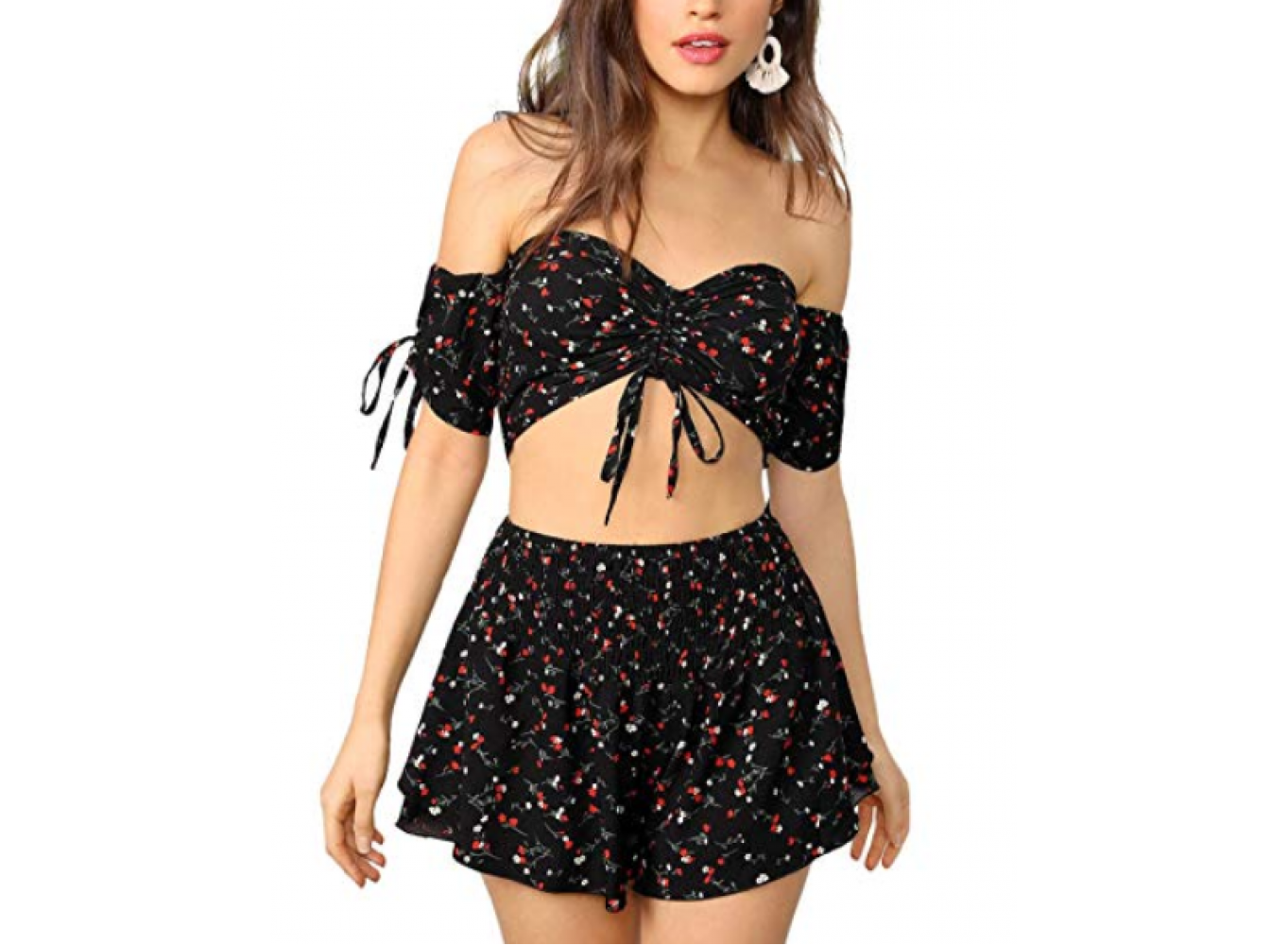 Conjunto Saia e Blusa Cropped Ciganinha Boho Floral Preto