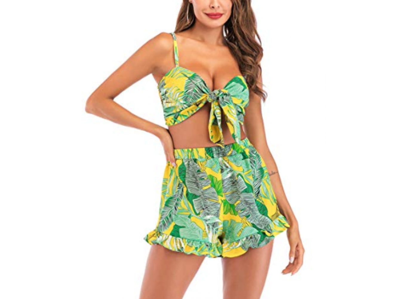 Conjunto Short e Top Cropped Amarração Folhagem Verde