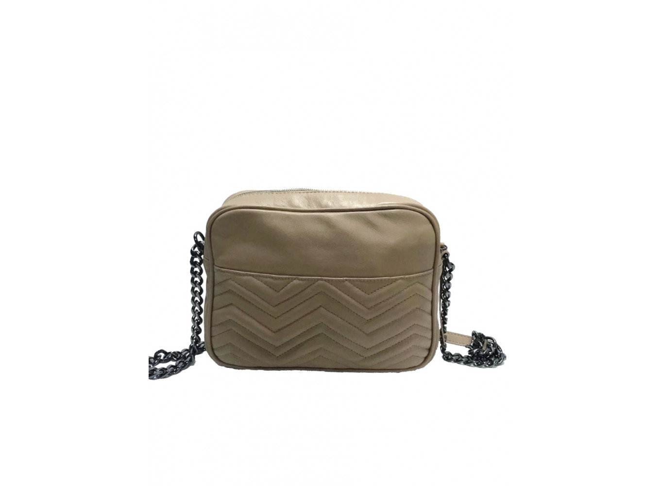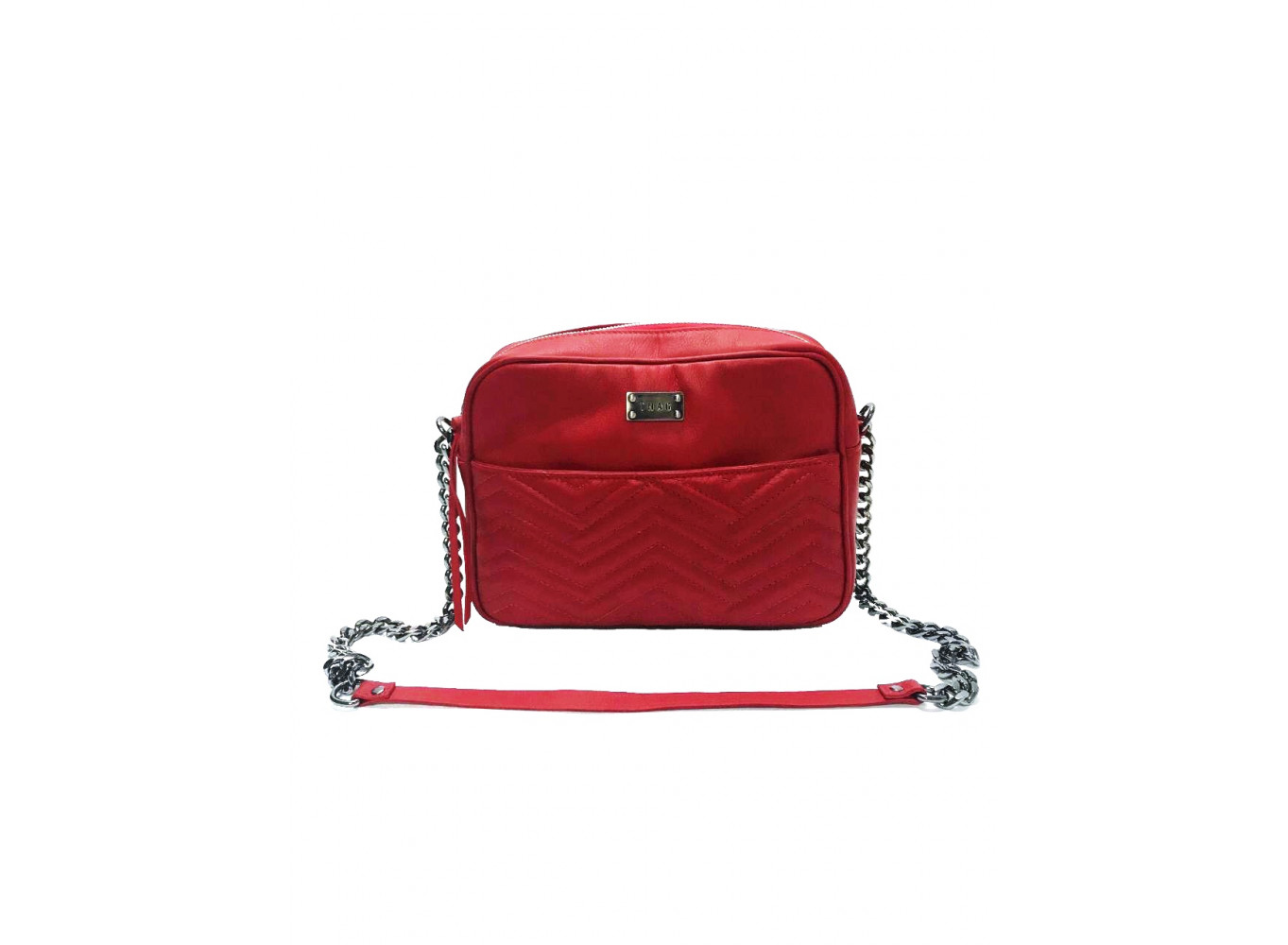 - Bolsa em couro, alça em couro e corrente.
